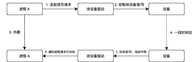 - 读:块设备驱动向设备发送读请求和目标地址,然后等待请求完成。此时发起请求的进程可以休眠,调度器可以调度其他进程(异步)。请求完成后,内核通知休眠进程读请求已完成,数据已准备好。